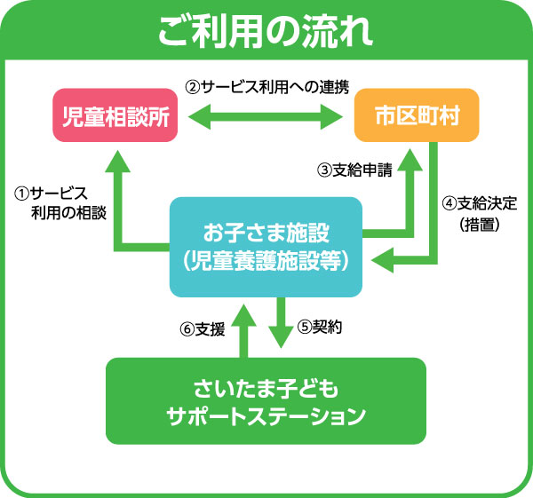 あらかじめ、お子さまの特性や支援の必要性について児童相談所等と共有し、市町村に申請を行っていただく必要があります。