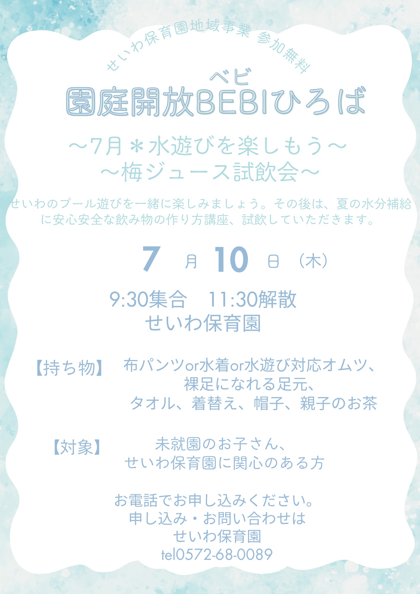 【持ち物】汚れても良い服装・着替え・タオル・帽子・お茶・布パンツor水着or水遊び対応オムツ